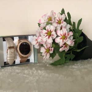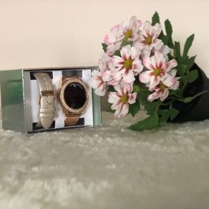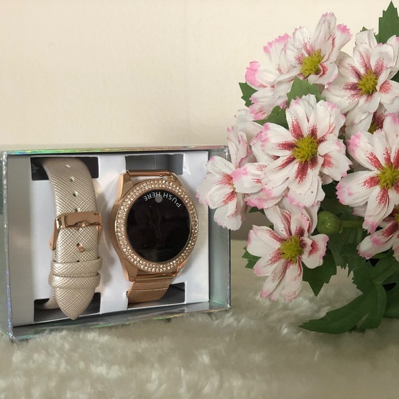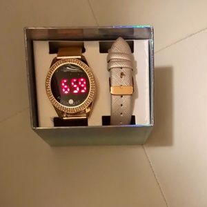 Dual strap digital watch with dazzling pave accents. Vibrant rose gold metallic and rose faux leather strap gives this smart watch look an edge, digital dial perfect for timing performance.