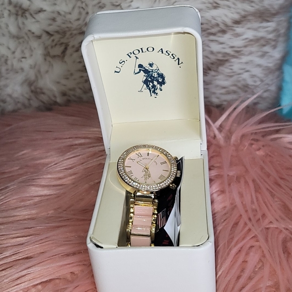 U.S. POLO ASSN. Pink watch worn 3 times but in tip top 👌 condition it was adjusted to fit me so some of the links were taken out (as shown in one of the photos) there's a small scratch on the band (as shown in one of the 📷) needs batteries as well.