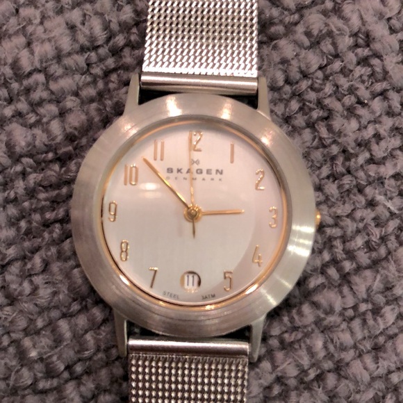 Silver watch with gold numbers and hands. Has an adjustable band. Band is 8” in length and face is 1” across. Only slightly used. The back is inscribed with a message regarding years of service.