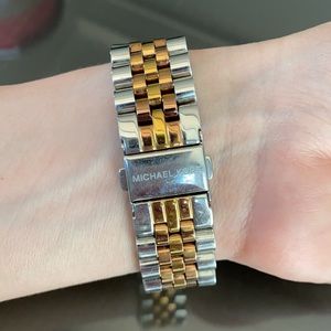 Michael Kors watch. Box not included. My wrist is around 6-6.5 inches around and I have a little wiggle room. A couple minor scratches where the Michael Kors logo is on the back of the wrist. Face with no scratches and in great condition.