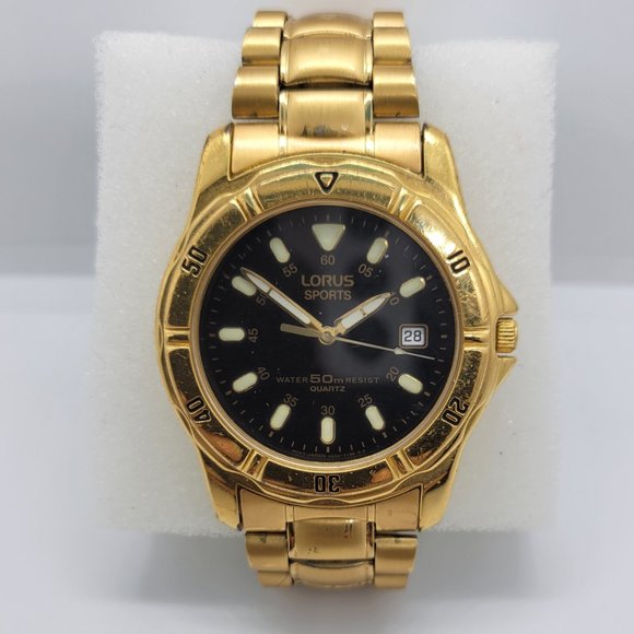 Lorus Mens Sports Stainless Steel Gold/Brown leather Band water 50m V532-7F40 Glow in the Dark hour marker (needs Battery, Sold as Is)