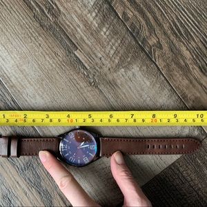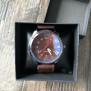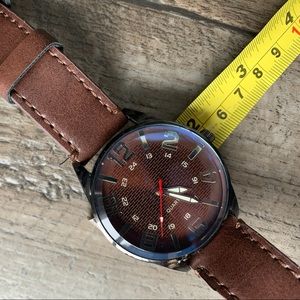 New, never worn Plastic protective tab still around crown Quartz movement Stainless steel back Watch face is about 1.75” in diameter Brown wristband