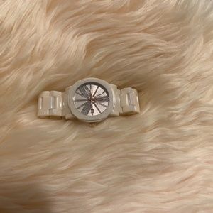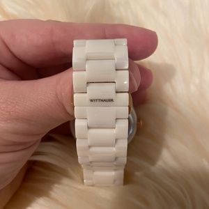 Wittnauer watch. Water resistant 50 meters, diamond face, ceramic & stainless steel, Japan movement, sapphire glass, designed by in New York by Bulova. Look at their website, it’s an excellent watch. No scratches and perfect condition.