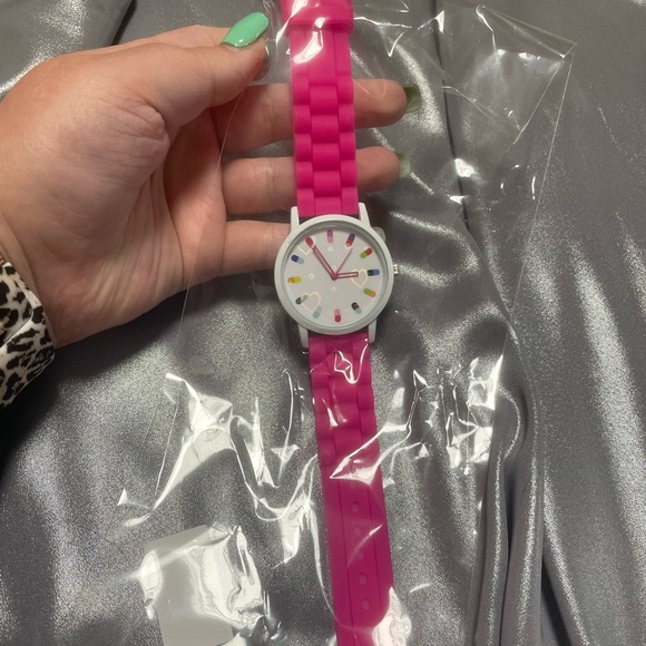 Hot pink watch with white face and many pills for the time it is nickel free it is also silicone new in packaging