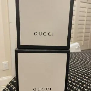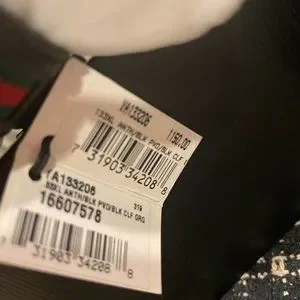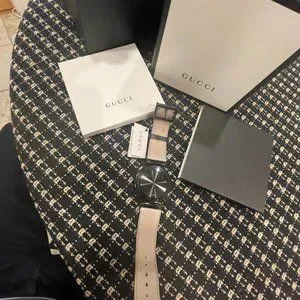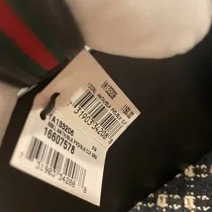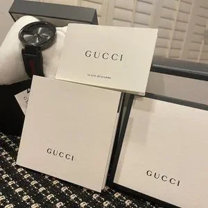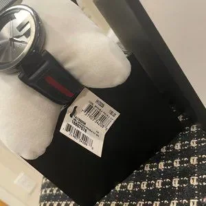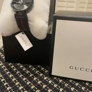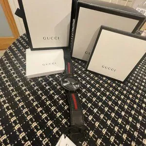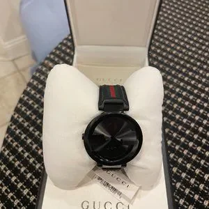 Black ion-plated stainless steel case with a black leather strap with red and green inlay. Fixed black ion-plated interlocking G bezel. Black dial with black hands. No markers. The Gucci name appears above center dial. Dial Type: Analog. Quartz movement. Scratch resistant sapphire crystal. Pull / push crown. Solid case back. Case diameter: 42 mm. Case thickness: 8.8 mm. Round case shape. Band width: 22.5 mm. Band length: 8.5 inches. Tang clasp. Water resistant at 50 meters / 165 feet. Functions: hour, minute, second. Dress watch style. Watch label: Swiss Made. Gucci Interlocking G Black Dial Black Leather Men's Watch YA133206.