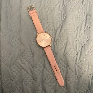 Big faced watch with light pink, leather band.