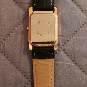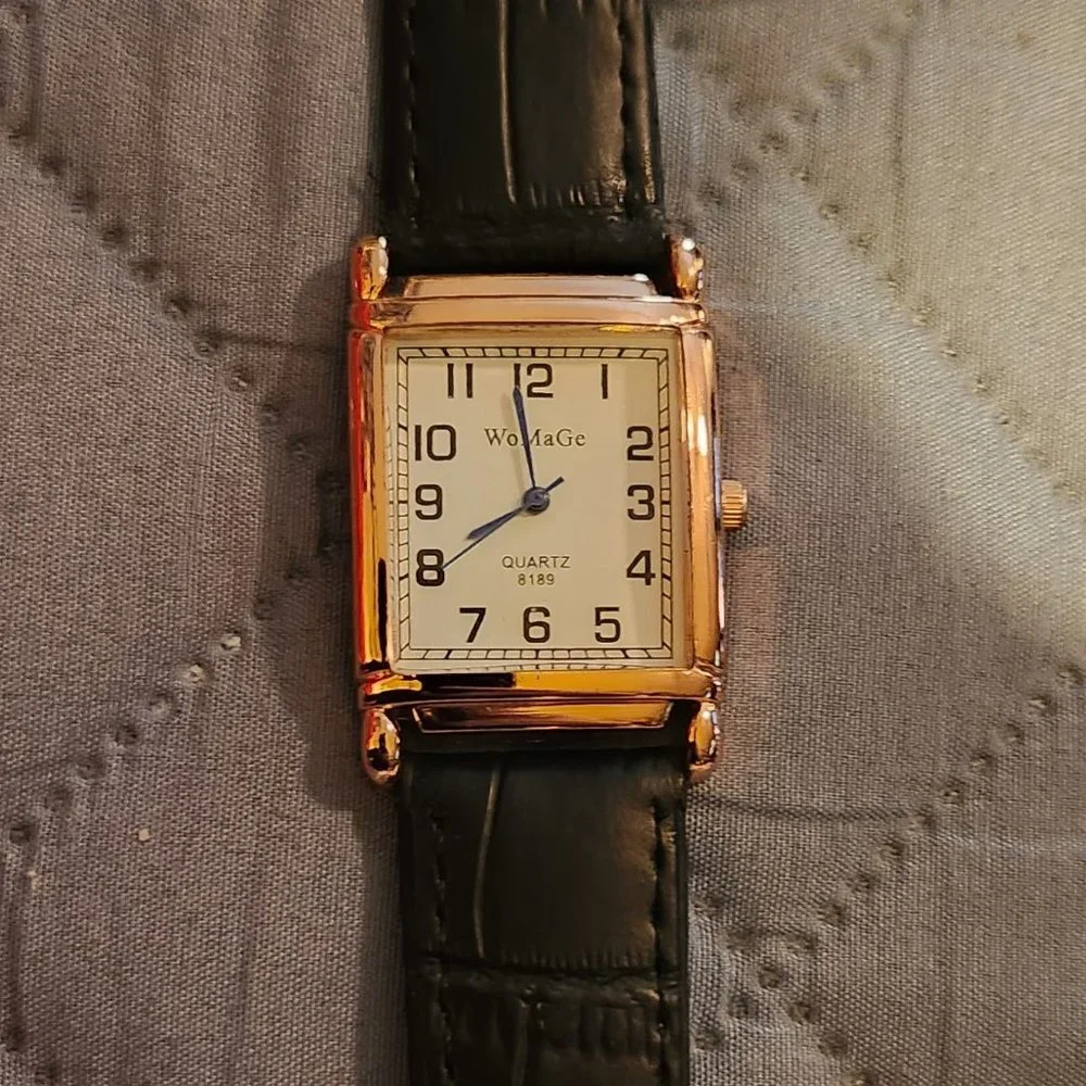 Contemporary WoMaGe quartz watch. Rectangular face with black strap 7"-9" long. Works.