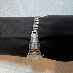 Watch with mother-of-pearl accent. Stretch band. Gently used. Small size.