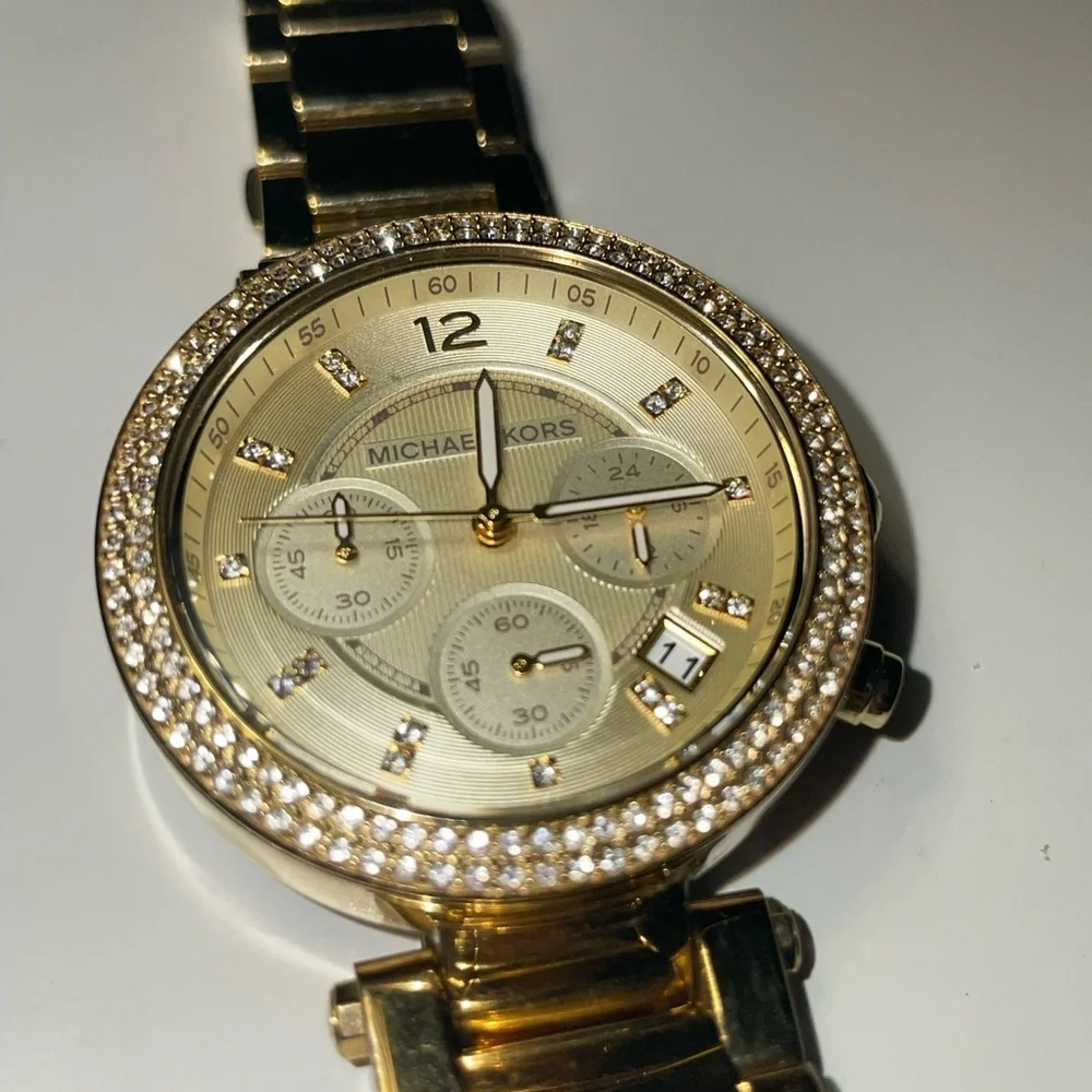 Michael Kors watch, gold, rhinestones. For smaller writs links were taken off, needs a new battery. Gently used great condition!