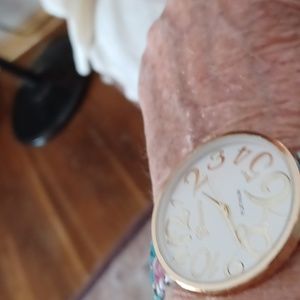 nice big face front, easy to read numbers, has a second hand, band is stretchband blue with pink flowers. Geneva design