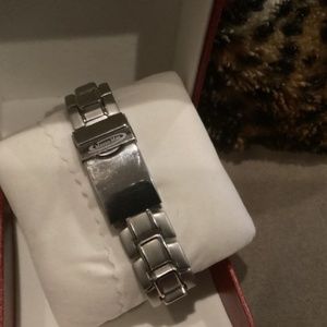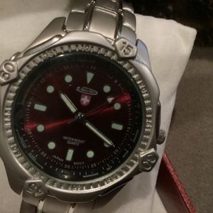 Flawless condition. Keeps perfect time. New battery. Silver stainless steel link band with locking clasp. Water resistant. Extremely heavy duty constructed. Well designed. Extremely well built. A bit heavy but well built and designed.