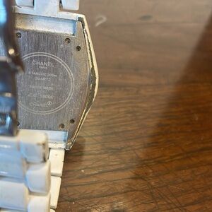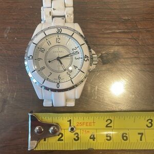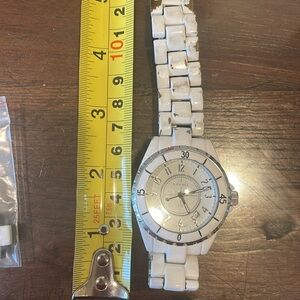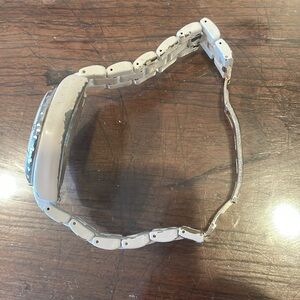 White metal watch. Comes with extra links to make larger. Heavy weight and well made. Signs of wear and tear including wearing away of white on the bracelet. Needs a battery. Note: Item is not authentic.