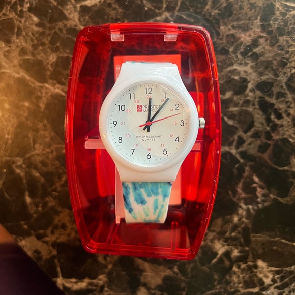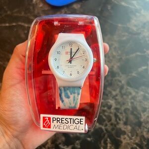 Brand new watch with second hand. Bought for nursing school but never used. Blue and white tie die. Original box