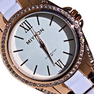 White and Rose Gold watch with sparkling gems.