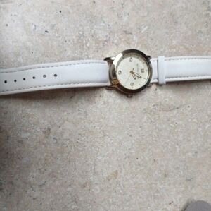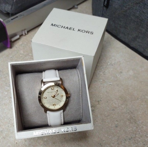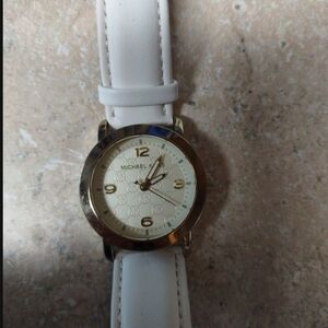gold face MK watch with white leather band.