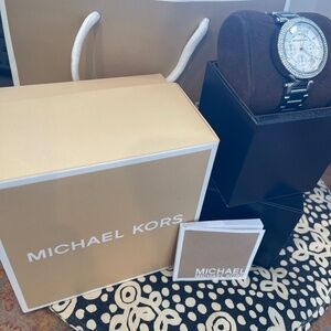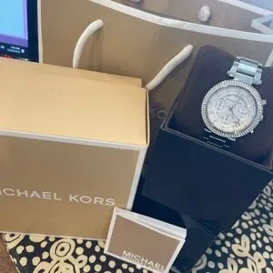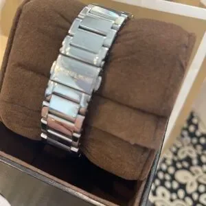 This Michael Kors Parker MK5353 Wrist Watch for Women is a stylish and elegant timepiece. Featuring a quartz movement and water resistance up to 30 meters This watch offers durability and precision. The stainless steel bracelet and case, along with the silver dial and embezzled crystal surroundings will light up anywhere you go! Arabic numeral indices, add a touch of sophistication to the overall design.