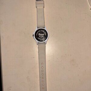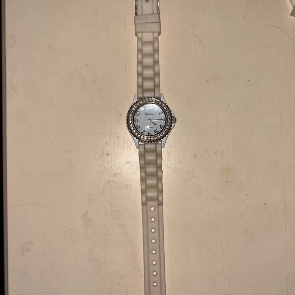 Geneva Platinum is the brand. White bejeweled face with silver accents. White rubber band is 8.5 inches. Good condition, no flaws besides a battery that will need to be replaced