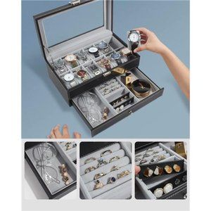 🧿DOUBLE LAYER : In the top layer of the jewelry case, there are 12 watch slots with removable velvet pillows. And in the bottom layer, there are adequate suitable area for your cufflinks, necklaces, bracelets, earring, brooches,sun glasses and any other jewelry and belongings.
