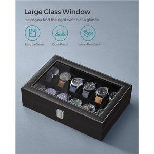 Watch Box 12-Slot Watch Case w Large Glass Lid Removable Watch Pillows Organizer