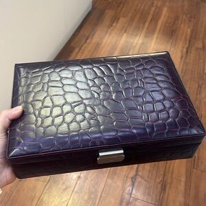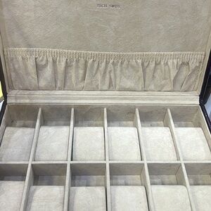 Watch Box which includes a key to keep watches safe and secure. Can store 12 watches. Inside is a beautiful suede soft lining.