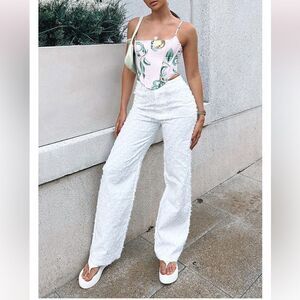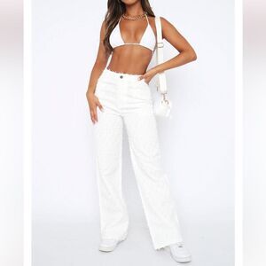 Earn style points with the Watch Me Work Pants in White. These pants are high-waisted and feature button and zip closure, straight leg style and textured fabric. We love this paired with a bralette and platform slides for a look we loving.
