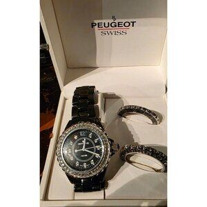 A sophisticated timepiece featuring a sleek black ceramic band and dazzling interchangeable bezels, presented in its original Peugeot Swiss box for added elegance.