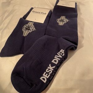 Anyone familiar with the Rolex Submariner sporting the black and bezel and black dial may or may not know that it is Rolex's highest selling watch ever. The watch made for divers comes with a hefty guard around that crown, important for a dive watch. Although just like 99% of 4x4 vehicles that are sold never go off road the same statistic goes with this iconic watch, hence the name Desk Diver, because that guy or gal is wearing it to work and has never put their pinkie toe in a flipper never mind donned a wetsuit. These fun socks are the perfect gift for that watch lover in your life, or for yourself if you happen to be a watch fan. Fit size 7-12 with 80% cotton, 17% Polyamide and 3% Spandex. Getem before they are gone 🤗