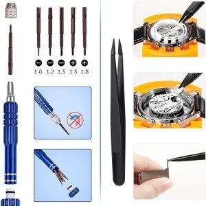 🧿【Suitable for different watch covers】- Watch back case opener is used for watch cases with grooves;watch case opening pry is used for the watch case with a pry opening;Screwdriver is used for watch case fixed by screws;tweezer is used to remove the battery.The use range of the watch back case opener is 15-60mm, and the drill bit spacing is set by rolling the adjusting wheel to fit the groove of your watch back.
