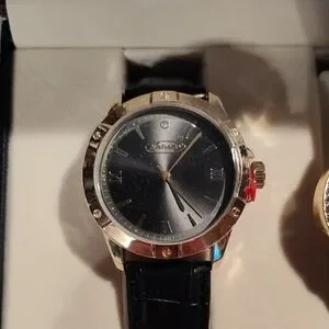 This elegant watch set features a sleek black and gold design, perfect for any occasion. The watches are crafted with precision and style, offering a sophisticated look. Both new in original box.