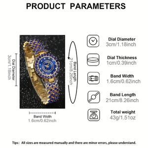 This beautiful women's quartz watch features a striking blue and gold color combination with a round face adorned with sparkling rhinestones.