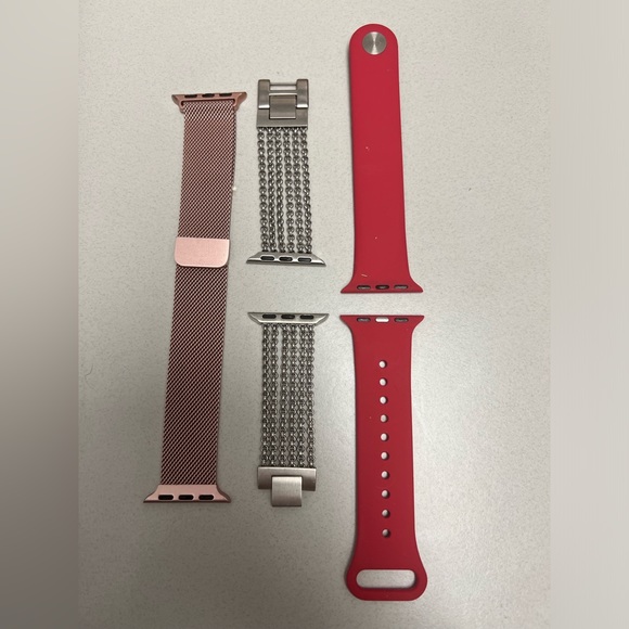 Excellent condition and barely worn 38mm iwatch bands. Rose gold metal/magnetic closure, silver traditional watch closure, silicone (pink) never worn sport band.