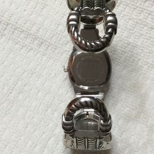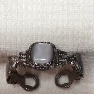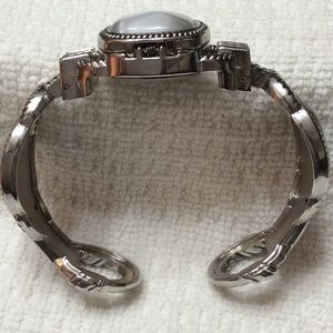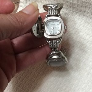 Silver/grey stones set in silver retractable hinged slip on bracelet. Watch needs new battery.