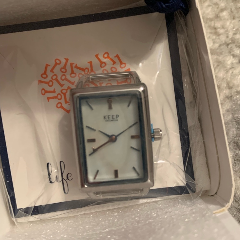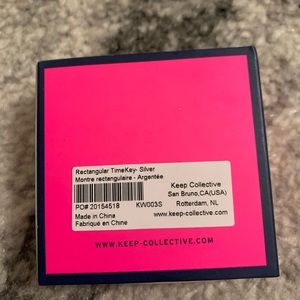 Silver rectangular time piece from Keep Collective. As you can see in the second picture, the pin hasn’t been pulled. Can be worn on most Keep bracelets.
