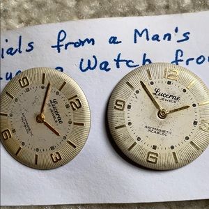 Watch face earrings made from the dials fo a men’s Lucerne watch from the 1960s. Never worn! Bought these from a local artisan bc they are so retro and unique.