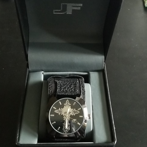 Watch for mens with a unique skull cross black man made material wide band NWOT (might need new battery) never used