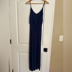 Watch the Sunset Navy Blue Maxi Dress size XS - I got this hemmed to fit me (5’4”). Length measures about 56.5 inches from top of strap to bottom but straps are adjustable so could be made slightly shorter or longer.