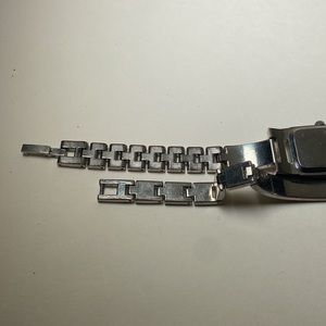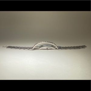 Silver. Features rhinestones. Pieces have some wear; fading. Watch needs new battery. Untested.