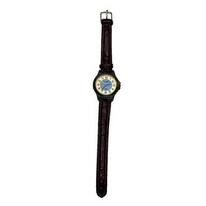 Ladies Watch-It Silver Gold Tone Blue Gold Dial Brown Leather Analog Watch Condition is Pre-owned. Needs new battery Some signs of previous wear. Stainless Steel. Japan Movt.