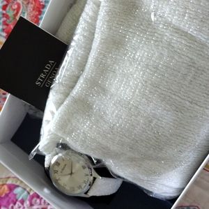 NWT Gorgeous Japanese movement Watch. Scratch resistant with white sequin faux leather strap. Acrylic white scarf to match. Still in original box, use as a gift or to use for yourself.😎