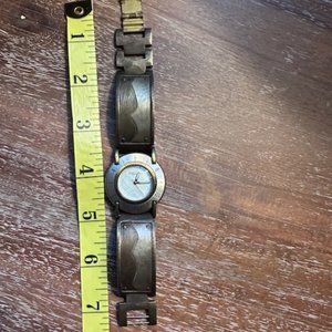 This beautiful watch has a copper-brushed dial in a round case. The band is made of nickel-free solid jeweler’s brass with copper trim overlap and a sterling wave design.