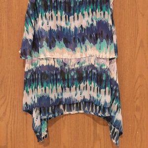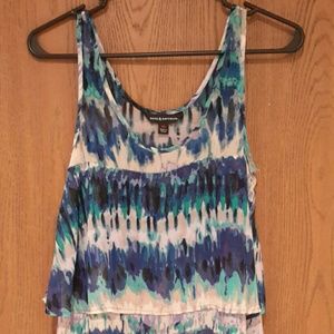 Colors even more vibrant in person, size XS, rock and republic. It is a longer flowy tank that falls just below the hips. No snags, stains, rips, or any other flaws. In like new condition, never worn.