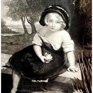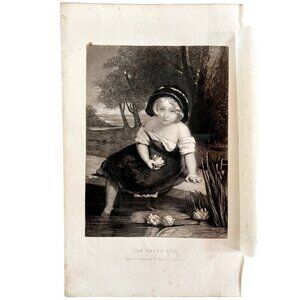 Water Lily Steel Engraving 1859 Victorian Adorable Girl At The Pond Art DWY5C