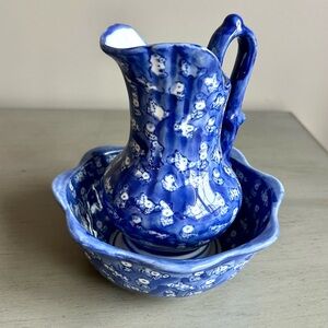 Water Pitcher and Basin Calico Blue White Flower Design Small 6 in Made in China