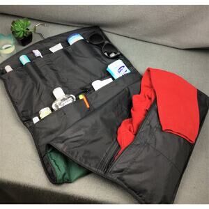 • Inside the top pocket is 8” high x 16” wide (zippered) with a divided slot pocket on it