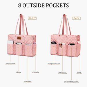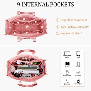 Features: This stylish tote is packed with 17 dedicated pockets, including 8 quick-access external compartments, a padded laptop sleeve, a waterproof cosmetics pouch, and 7 internal mesh pockets. It keeps everything from tech gadgets to toiletries organized, visible, and secure. The strong zipper closure adds peace of mind, preventing spills during busy days.