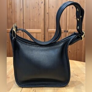 Features: Thick and supple vegetable tanned glove leather, solid brass hardware, zipper closure, interior full depth slip pocket, detachable adjustable strap, Coach hangtag (not original to this bag).