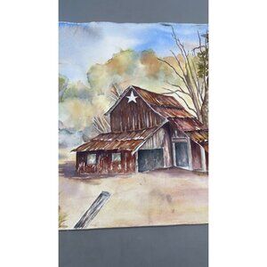 Watercolor Artwork Of Rustic Barn & Trees Farm landscape brown On Textured Paper