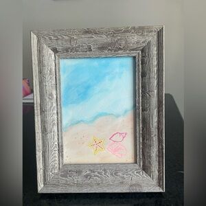 Enhance your home with this beautiful beach scene art. Featuring calming blue water and soft pink seashells, this piece adds a touch of tranquility to any room. The rustic frame complements the artwork perfectly.
