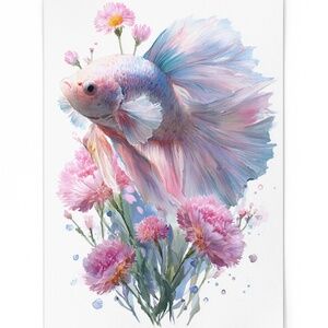 Watercolor Betta Fish with Flowers Wall Art Print Unframed - Enchanting Aquatic