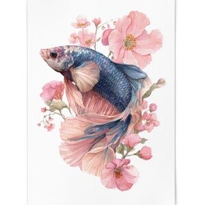 Watercolor Betta Fish with Flowers Wall Art Print Unframed - Enchanting Aquatic
